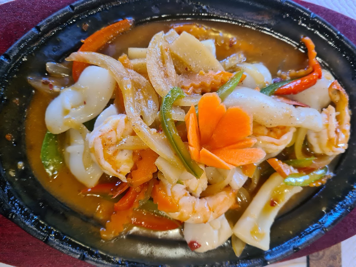 Seafood lovers often gravitate toward the Fruits de Mer À la Sauce Piquante Sur Plaque Chauffante. Served sizzling on a hot plate, the dish arrives at the table with an irresistible aroma. The seafood stays tender while the spicy sauce brings warmth and depth to the flavors. Watching the plate continue to sizzle adds a bit of theatre to the experience, something diners often mention when talking about their visit.
